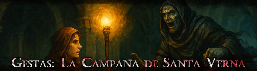 En la aldea marchita de Santa Verna, una antigua ermita se alza sobre colinas yertos. Sus campanas repican solas en la medianoche, haciendo que el silencio rural se quiebre con un tañido siniestro. Tiempo atrás, el campanero Tomás Belardo encontró una muerte impía en la torre, y desde entonces la tierra está maldita. Los aldeanos susurran que su alma en pena vaga bajo la ermita, en las catacumbas olvidadas, condenada por su sacrilegio. Ahora, un grupo de aventureros deberá descender a las entrañas de Santa Verna para enfrentarse a la oscuridad sepulcral, calmar al espectro torturado de Tomás y liberar al pueblo de la maldición gótica que lo consume.