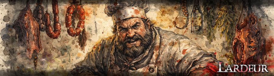 Se te conoce como «lardeur», señor de la grasa. No eres un simple cocinero, ni un vulgar carnicero. Tampoco un chamán… aunque algo de todos ellos habita en ti. Recorres los páramos cuchillo en mano, oliendo la carne del mundo. Sabes cuándo un hígado es tóxico, cuándo una grasa está bendita, cuándo una víscera emanará sabores exquisitos al hervirla a fuego lento. Para ti, cada criatura es una despensa andante, cada cacería una comunión, cada banquete un sortilegio.
